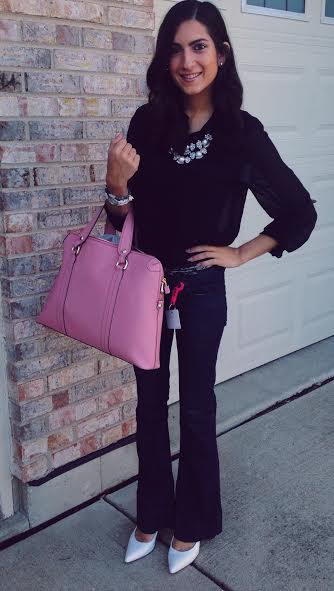 | Shirt: Forever 21 Bag: Henri Bendel Necklace: New York & Company Shoes: Ralph Lauren at Macy’s |