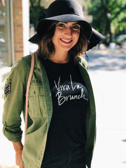A graphic Tee with a cute (brunch) quote is usually the winner for me, and yes, I have multiple shirts with brunch quotes. Weather depending, I will throw on a jacket because I am ALWAYS chilled in restaurants, until the mimosas start flowing. A pair of yoga pants is usually the go-to if I am going more of the sporty look route (which is usually what ends up happening), BUT this time, I chose to wear my SUPER comfy jeggings- which are basically leggings that look like jeans, so it’s actually perfect. Top the look off with a cute hairstyle or if you are feeling a little lazy/don’t want to add any more dry shampoo to your hair, a baseball cap or floppy hat will do the trick!