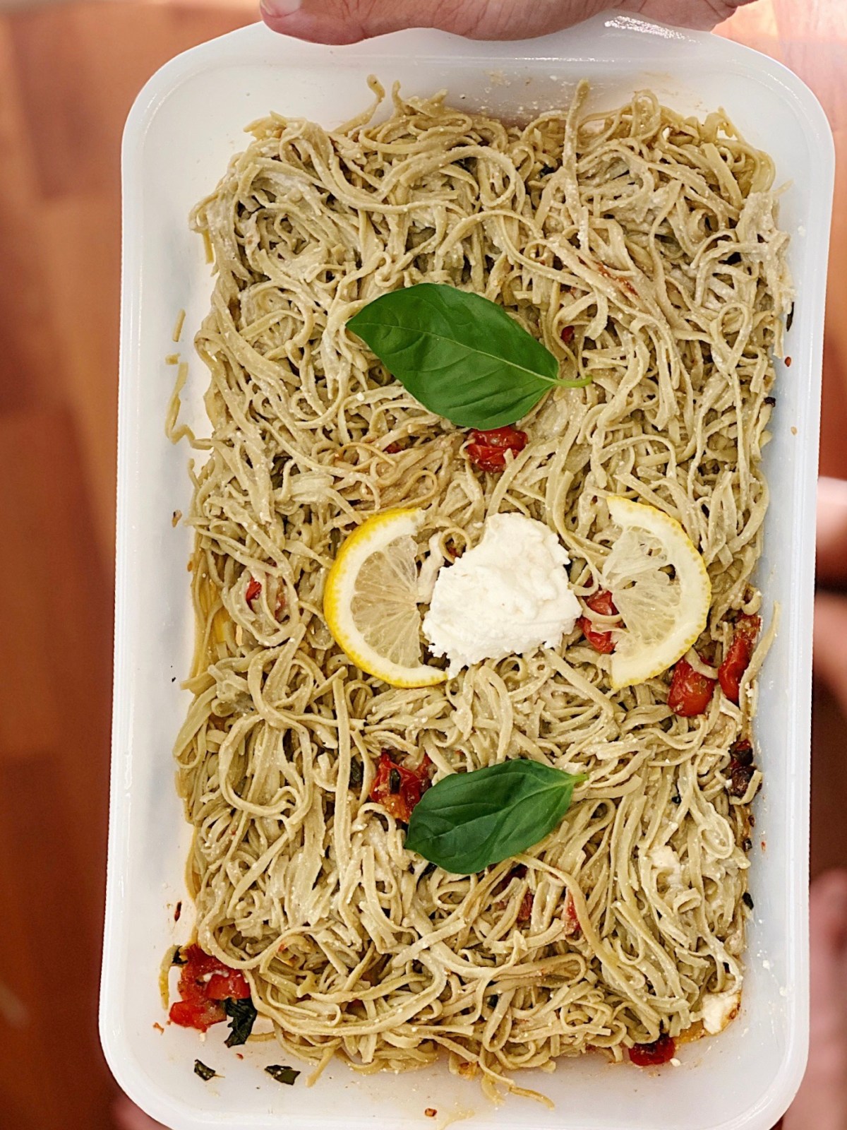 Directions: Sauté sliced cherry tomatoes with basil leaves in EVOO, salt and pepper. In a pot of boiling salted water, cook edamame pasta and save about 1/2 cup of reserved pasta water. In a serving bowl, combine and mix lemon juice, 1/2 cup pasta water and 1 cup Ricotta cheese. Add in pasta and mix together (I like to drizzle a little EVOO and toss the pasta to avoid it from sticking to the dish). Top with basil leaves, lemon slices and a dollop of Ricotta cheese.