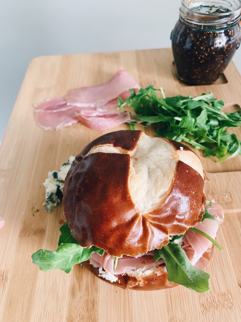 Directions: Slice the pretzel bun in half and spread fig jam on each half of the bun. Add prosciutto (for me, the more the better) and spread your blue cheese on top. Finish by adding arugula on top. Eat and enjoy!