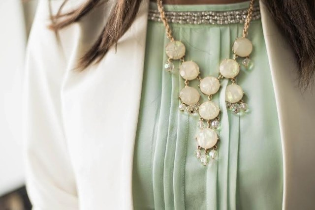 The white blazer is from Forever 21 and the aqua halter is from Express